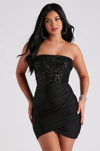 Cue the sparkle and you in this stunning sequin short dress destined for the dance floor! Featuring a strapless square neckline, a sequin-patterned bodice, and a satin bodycon asymmetrical wrap hem. Style with chic heels to complete the look!
