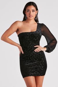 Step up your formal attire with a luxe velvet dress that brings sophisticated style to your special occasion! Claire features a one-shoulder neckline, a wired V-neck bust, a fitted long sleeve, a high side slit, and a midi-length, curve-hugging silhouette. The dress is composed of a smooth velvet fabric that offers moderate stretch. Complete the look with rhinestone chandelier earrings.