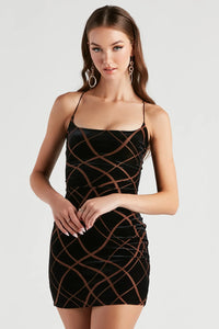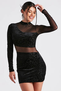 Step and stun in this short dress for a night on the town! It features long sleeves, a mock neck with dual button closures, a keyhole cutout, a burnout velvet scroll, and sheer mesh inserts throughout the body-hugging silhouette. Complete the look with statement earrings.