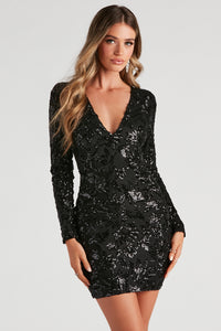 Keep your look luxe and glamorous in a sequin dress that slays! This mini dress features a V-neckline, long fitted sleeves, a short, curve-hugging silhouette, and all-over sequin embroidery in a chic scroll pattern. The sheer mesh fabric includes a full knit lining. Style with lace-up heels for your next cocktail party.