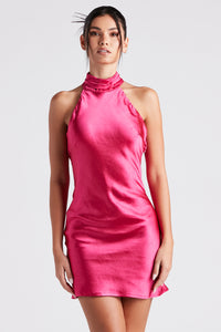 This silky satin skater dress features a trendy V-neckline with a halter strap, an open back with an adorable tie-back bow design, and a short skater skirt with a flirty fit-and-flare silhouette. Get ready to be twirling all night in this perfect dress styled with rhinestone earrings and block heels.