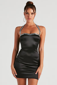 Show off a sleek sparkle in this silky satin mini dress. It features a sleeveless sweetheart neckline with a chic sequin embroidered trim at the bust, thin halter straps with sequin embroidery, and a short, curve-hugging silhouette. The smooth satin-knit fabric offers a moderate stretch. Style with rhinestone heels for a night out at the club.