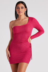 Hit the town in this glitter mini dress to sparkle under the spotlight! It features a one-shoulder neckline, a long fitted sleeve, and a side cutout with an adjustable drawstring-tie design, and a bodycon silhouette. Complete the look with an envelope clutch!
