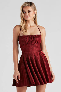 Bring the glitz to your school dance in the Kaylee formal short dress that radiates timeless glam! She features a sleeveless scoop neckline, a ruched bodice paired with an empire waistband, and adjustable spaghetti straps that cross at the back. Her high waist leads to a pleated party-length skater silhouette paired with hidden side pockets. The mini dress is composed of a woven glitter fabric with a full knit lining. Complete the look with sleek hoop earrings and clear heels.