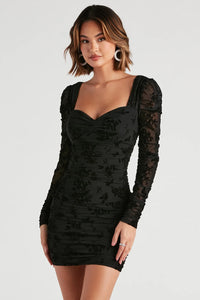 Romantic and sultry, the Clara short dress brings allure to your next celebration or holiday dinner! She features a sweetheart neckline, a lightly padded bust, ruched long sleeves, and a bodycon silhouette with ruched side seams that accentuates your curves. The formal dress is composed of a floral velvet flocked pattern on mesh fabric with a sewn-in knit lining and moderate stretch. Style with rhinestone stiletto heels for a glam look!