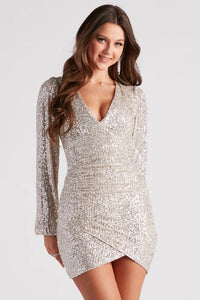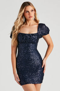 Show off your love for party season in this sequin mini dress that will bring the glam factor to your look! It features a square neckline with ruching at the bust, short puff sleeves, a mini-length, curve-hugging, bodycon silhouette, and all-over sequin embroidery that will catch the light with each step you take. Complete your outfit with rhinestone statement earrings.