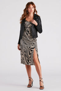 Stylish marble swirls capture all the attention on this satin midi dress featuring a sleeveless v-neck, adjustable spaghetti straps, flexible boning inserts along the bodice, and a curve-hugging silhouette with a front slit accent. Complete the look in a casual crop jacket.