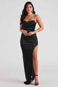Amp up the sultriness of your formal look with the sleek and stunning Bailey satin dress! She features a sleeveless cowl neckline with layered pleated detailing, rhinestone embellished chain-link shoulder straps that are removable to make the dress strapless, a fitted empire waist, a curve-hugging silhouette, and an asymmetric floor-length hem creating an ultra-high side slit. The smooth satin-knit fabric offers a moderate stretch. Style with rhinestone fringe earrings for your next fancy soiree.