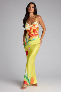 Giving island goddess IRL. This floral satin maxi features a draped cowl neckline, crisscross back, and curve-skimming fit—perfect for destination weddings, summer soirées, or any RSVP that calls for a slay.