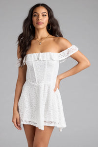 The perfect blend of sweet and sultry, this lace skater dress is designed with a flirty off-the-shoulder neckline and corset bodice that accentuates your figure. Style with sandals for shower celebrations or graduation!