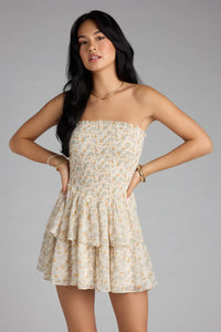 Bring the sweet flirty vibes to your weekend plans in this cute mini tube dress with a dainty floral print on lined chiffon fabric. The strapless smocked bodice leads to a V-shaped waist, tiered ruffled design, and flowy skater silhouette.