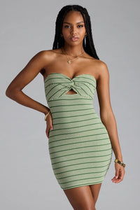 Show off your cutie style in this adorable mini dress made with striped ribbed knit fabric with high stretch. The strapless sweetheart neckline features a knot detail at the bust and a small keyhole cutout for a trendy detail.