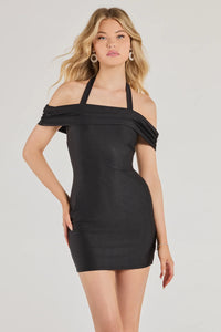 Step out looking chic in this off-the-shoulder mini dress featuring halter straps, a foldover design, and a bodycon silhouette that flaunts your figure. Style the dress with earrings.
