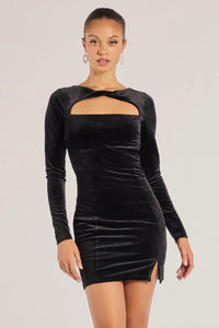 The velvet mini dress features a crew neckline with a twist accent, a cutout above the bust, an open lower back design, long fitted sleeves, and a chic side slit at the mini-length hem. Complete your formal outfit with rhinestone heels.
