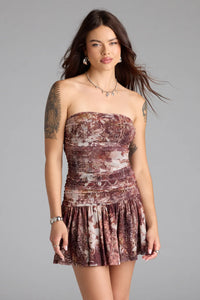 Take a trip downtown or somewhere new in this strapless abstract print dress! With a cutout back, form-hugging fit, and ruffled mini hem, it's the ultimate look for summer.