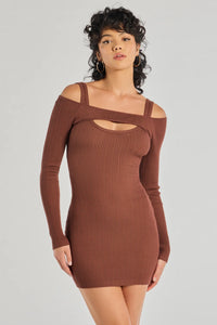The ribbed knit dress features a scoop neckline with tank-shoulder straps, a faux topper accent with long sleeves, and a mini-length hem. Complete the look with ankle booties.