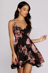 Bloom into the night with this bold skater mini! Dress features a surplice-style bodice with V neck, back zip, and adjustable spaghetti straps and a flow-y, gently pleated A-line skirt with curved hem. Dress is nearly fully lined and made from a chiffon-like material with little to natural stretch.