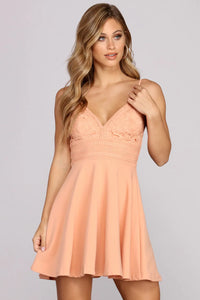 Bring a flirtatious side to your look with this adorable flowy skater dress! It features a sleeveless bodice, spaghetti straps, a V neckline, a square back that hits about mid-length with a zipper and hook and eye closure, and a head turning mid thigh skater skirt. The top showcases a crochet lace floral design lined with a stretchy crepe fabric that runs the full length of the dress.