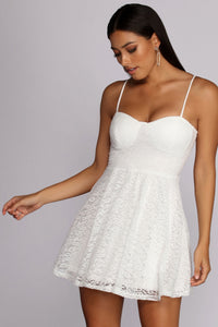 Become our sweet little baby-doll in this adorable dress! With a sweetheart neckline, spaghetti straps, and padded cups, she has a fitted bodice and a skater style skirt with a soft inner lining. The lace dress has a zipper back and offers a relaxed flowy skirt with minimal stretch fabric.