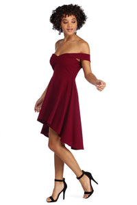 This burgundy skater dress shows such sweet elegance! Dress features a sweetheart off the shoulder neckline, a padded bust, an exposed back zipper closure, and a fitted bodice with a high waist seam leading to a flowy high-low skirt. Dress is composed of an unlined crepe fabric with a moderate stretch.