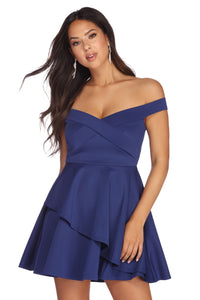 Shine in the spotlight as you make an effortlessly glam appearance in this navy skater! This must have dress features an off the shoulder neckline with off the shoulder strap accents, a sweetheart bust and princess seams. The relaxed fit bodice leads to a flared skater skirt with overlay accent to create a twirl worthy moment. Dress is composed of a scuba knit fabric that offers a moderate stretch.Model is 5'9" with a 34" bust, 24" waist and 34.5" hips. She is wearing a size small