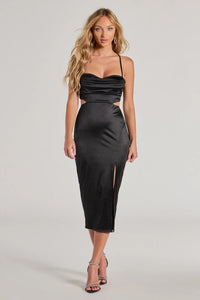Showcase your gorgeous silhouette in the Leona satin bodycon midi dress featuring a sleeveless sweetheart neckline accented with a pleated cowl overlay, and spaghetti straps leading to an open lace-up strappy design for a customized fit. The sultry side cutouts at the waist and the high-cut side slit add a bold allure. Complete your stunning cocktail party look with stiletto heels.