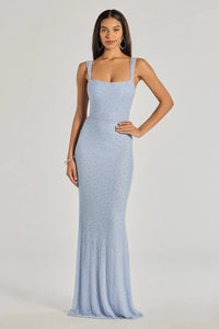 Grace the room in the Kimia long column dress that is crafted with all-over beaded embroidery in a detailed swirl pattern on the lined mesh fabric. It features a sleeveless square neckline with a padded bust, thin adjustable shoulder straps, a bold open-back design with lace-up straps, and a floor-sweeping column silhouette to showcase your stunning curves.