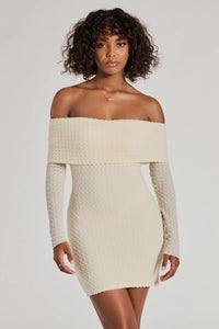 Keep it trendy chic in a mini dress that features a fab textured design, an off-the-shoulder neckline with a foldover accent, and fitted long sleeves. Complete outfit with heels for the perfect date night look!