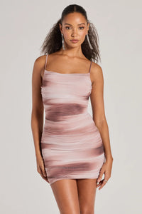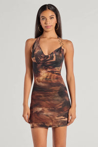 A sleeveless mini dress boasts a flattering square neckline, spaghetti straps, and a lace-up back, The abstract printed mesh fabric wraps your body creating the bodycon silhouette and is finished with a mini-length hem.