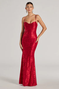 Create a captivating look that exudes romance in the Drea mermaid dress designed with lined mesh with a chic velvet burnout design and a bold metallic-like floral pattern. She features a sleeveless square neckline with adjustable spaghetti straps for a customized fit, an alluring open back with a lace-up strappy design, and a floor-length mermaid silhouette to highlight your stunning curves.