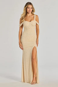 The long formal dress features an off-the-shoulder neckline with cold shoulder strap accents, a sweetheart bust, faux pearls throughout, and a mermaid silhouette accented with a high-side slit. Complete the outfit with a sleek metallic clutch.