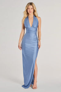 Dare to be sultry in the Darla floor-length formal dress boasting a plunge halter V-neckline, revealing open back with a chic bow tie, and a high side slit to show off your heels of the night.