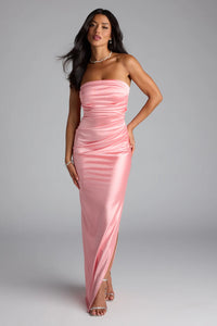 Classic with a chic allure will be your vibe in the Maude strapless mermaid dress. The pleated wrap-front design creates a high-cut slit that will turn heads.