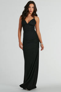 Prepare to wow the crowd in the May glitter formal dress designed to show off your sparkle at prom and upscale birthday parties! This stunning gown is designed with a flattering V-neckline, spaghetti straps, and a lace-up strappy back for added allure. The side ruched seams accentuate your curves along the mermaid silhouette, while the glitter knit fabric adds a touch of luxury to this floor-length dress. Complete the look with earrings and heels for an unforgettable night!