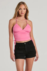 Care to have it all with this sultry crop top? It boasts a halter V-neckline with a spaghetti strap tie, a low back cut to flaunt some skin, and adjustable side drawstrings let you customize the fit along the cropped hem. Complete the look in women's best-selling bottoms for any casual occasion!