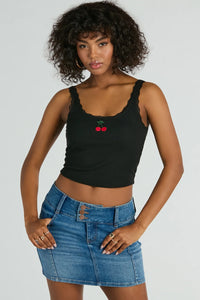 You'll surely pick this tank top for its adorable vibes! With its lace trim scoop neckline and embroidered cherries, it's the perfect blend of sweet and sassy. The fitted crop hem and stretchy rib knit fabric add a touch of comfort and style. Complete the look in a denim mini skirt.