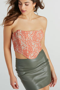 Your allure will be irresistible in this lace corset top! It features a strapless neckline, flexible boning inserts for structure, a curved cropped hem, and multiple back hook and fasteners on darling lace-lined fabric. Complete the look in high-rise pants for a wine bar!