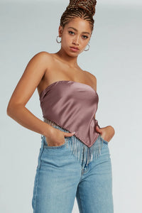 This strapless satin top exudes classy elegance and sultry! Perfect for date night or a dinner party, features a strapless stretchy smocked tube top lining and tie-back design. The rhinestone fringe trim adds a touch of sparkle to the satin overlay, for a bold and daring fashion statement. Complete the look in high-rise jeans and mules!