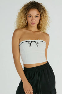 Everyone will fall for you in this strapless crop top perfect for capturing a girlycore vibe! The strapless neckline is accented with delicate lace and a playful ribbon bow trim. The underbust seam gives a flattering fit, while the fitted crop hem adds a touch of sass. Complete the look in high-rise denim jeans for casual plans!