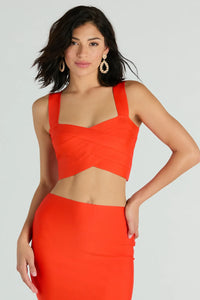 You'll be set to receive compliments in this bandage crop top! Perfect for vacation or a chic night out, this top features a flattering sweetheart neckline and cropped silhouette on bandage knit fabric designed to fit like a glove. Complete the look with the matching skirt.