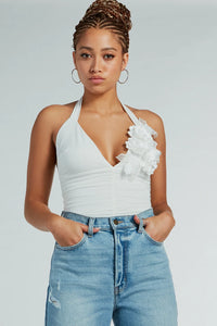 Defy expectations and turn heads in this sleeveless bodysuit at parties or as the sultry bride-to-be! The daring plunge halter V-neckline and intricate floral applique add a touch of polish to a form-hugging silhouette. The ruched detailing accentuates your curves, while the thong bottom with snap-button closures secures the style. Complete the look in a chic midi skirt and strappy mules.