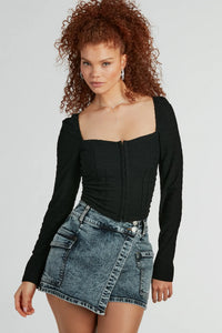 Make a statement in corset tops, cropped bustiers, and sleek bodysuits designed in standout fabrics like lace, mesh, satin, and chiffon. Prefer a little edge? Try faux leather, denim, or sheer-paneled styles with eye-catching details that keep your look fresh and modern.