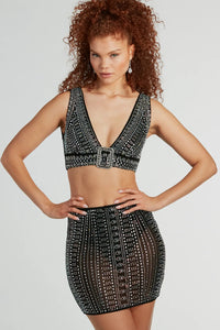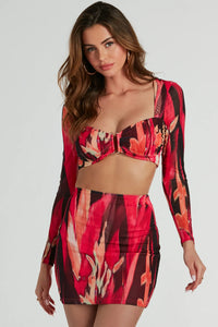 Create an iconic festival 'fit with this bold abstract mesh crop top! Designed with a stretchy sheer mesh fabric, this top is accented with an eye-catching abstract print that will spark up all the compliments. It features a sweetheart neckline with a trendy U-shaped wired insert, long fitted sleeves, and an ultra-cropped hem to showcase some skin. Style with the matching mini skirt and a pair of combat boots!
