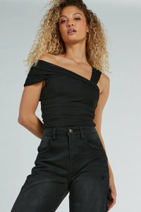 Level up your cool girl status with a sultry bodysuit that slays! Designed with a stretchy sheer mesh fabric, this bodysuit features an asymmetric neckline with a tank strap and an off-the-shoulder short sleeve for a trendy silhouette. The ruched side seams will accentuate your curves on the form-hugging fit. The bodysuit has a thong-cut bottom with a snap button closure. Style with cargo pants for a casually chic night-out look!