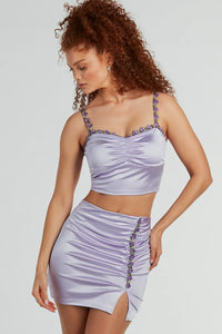 Bring the flirtatious vibes when you arrive at the party in this sweet floral trim crop top! The stretchy knit fabric showcases a stunning sheen to catch everyone's eye. The top is shaped with a sleeveless sweetheart neckline with ruching at the bust, spaghetti straps, and dainty floral embroidered applique trim on the neckline and straps. The fitted cropped hem will give you that snatched look. Complete your fab look with the matching mini skirt!