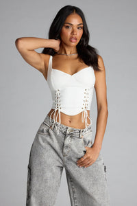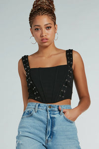 Show up your next night out looking like a sultry stunner in this lace-up corset top! Made with a lined woven fabric with moderate stretch, this top is shaped with a sleeveless square neckline, tank shoulder straps with a trendy lace-up grommet design, and flexible boning inserts for that structured silhouette. The back zipper closure offers a secure fit, and the angled cropped hem creates a chic snatched look. Style with high-rise jeans and combat boots.