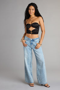 Giving high-glam with zero effort. This sleek satin tube top stuns with a bold cutout and luxe metal trim—made for date nights!