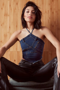 Everyone will be looking at you in this denim crop top at concerts, festivals, or a night out with the girls! The top features a flattering halter neckline with a convenient spaghetti strap tie closure, a trendy front pocket, and a pointed crop hem that flaunts your figure. Complete the look in sleek faux leather pants.