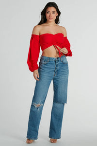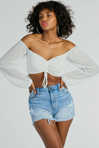 Be an alluring daydream come to life in this off-the-shoulder crop top to bare some skin on a breezy sunshine day! Made from smooth woven fabric, this top boasts romantic peasant long sleeves and ruffled trim, a front adjustable ruched drawstring that lets you customize the style, and a stretchy smocked back for easy wear. Complete the look in high-rise jeans and sandals for any occasion!