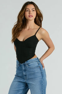 This trendy woven corset top will give off a sultry flair with its chic details and alluring silhouette! Made with a smooth woven fabric with moderate stretch, this top features a sleeveless sweetheart neckline with a bust seam outline, flexible boning inserts to add structure, spaghetti straps leading to a back zipper closure, an angled cropped hem, and a form-hugging fit for that signature snatched look. Style with straight-leg jeans and strappy mules.